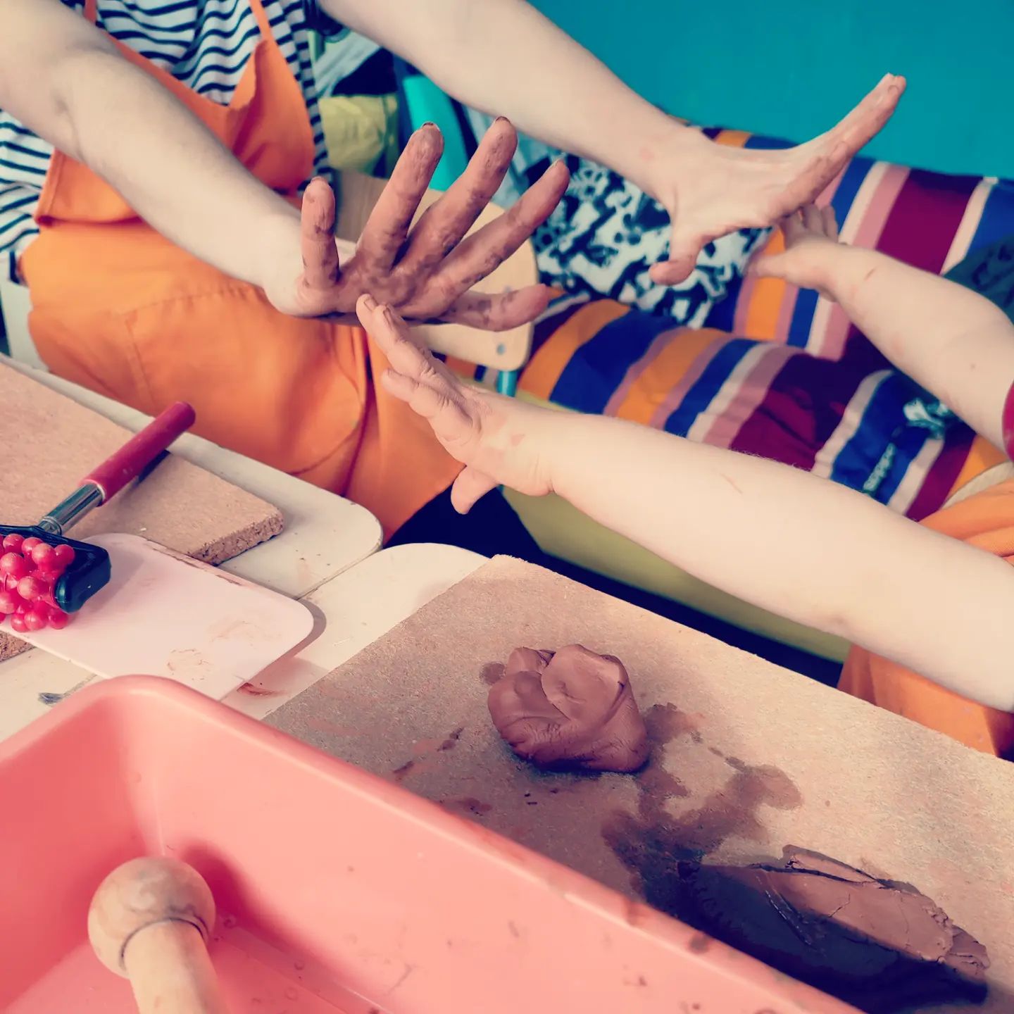 É mole ou é duro? Vamos lá então, marca lá a mão. Podemos esticar e também modelar. Aqui quanto mais se experimentar mais nos vamos sujar! Vamos meter as mãos no barro! Apertar, molhar, sentir a sua textura e até com ele até pintar. Nesta oficina sensorial a pasta cerâmica é o ingrediente principal.
